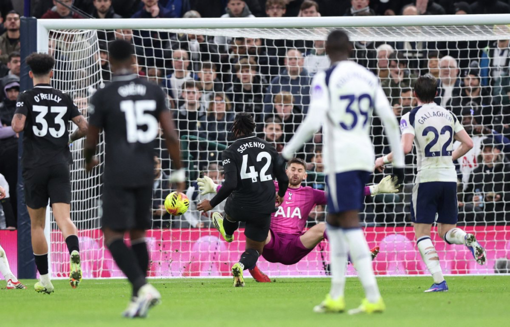 El encuentro arrancó con cautela, pero todo cambió tras una pérdida en la salida de los Spurs. Bissouma intentó conducir por el mediocampo, Bernardo Silva le robó el balón y descargó de inmediato para Erling Haaland. El noruego tocó de primera para Rayan Cherki, quien avanzó por el sector derecho y, ante la nula presión defensiva, acomodó el balón a su pierna derecha para sacar un potente disparo cruzado desde fuera del área que se coló pegado al poste izquierdo. Golazo y 1-0 para los Citizens.